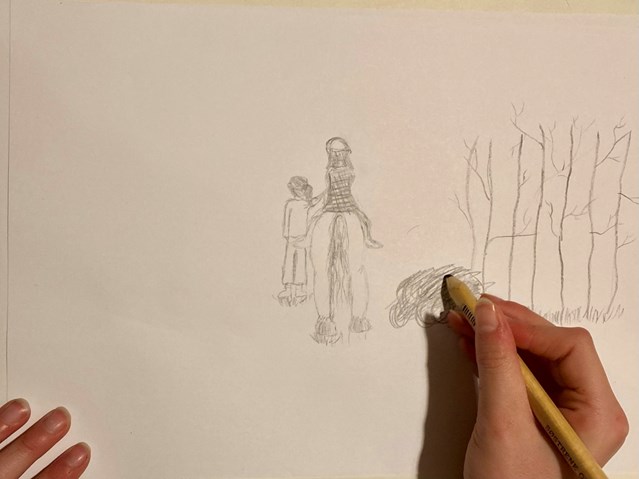 Og en tegning, som hun begyndte på efter rideturen, og som jeg har fået lov at vise.